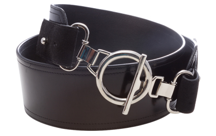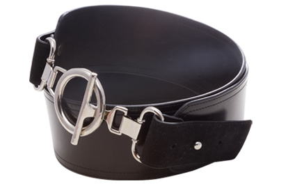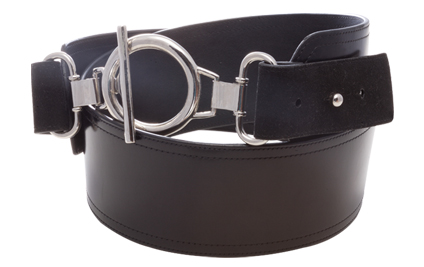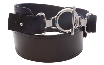 Rich black leather belt with it's high-gloss finish. Adjustable, functioning suede accents with toggle closure. Available in small, medium and large.