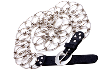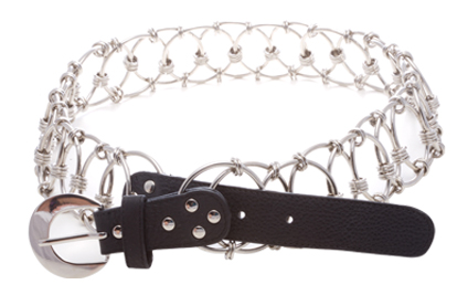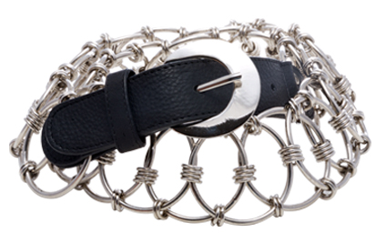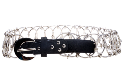 Circular-linked rings brings contemporary urban chic look, worn either tightly nipped and high on the waist or slung low at the hip. Black pebbled leather accents. Available in small, medium and large.