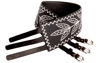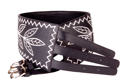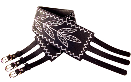 Silver color thread embroidered leaf motif on hard cow leather. Tapered in the middle, three nickel buckles. Available in small, medium and large.