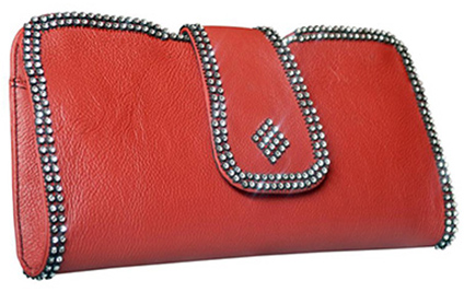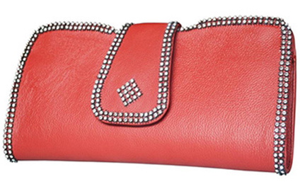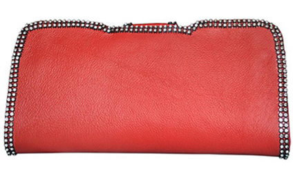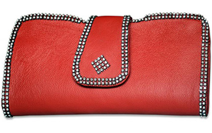 Red leather clutch lined with two strands of sparkling white beads, making this bag a perfect companion for a night out with friends. Interior black polyester lining with multiple pockets.