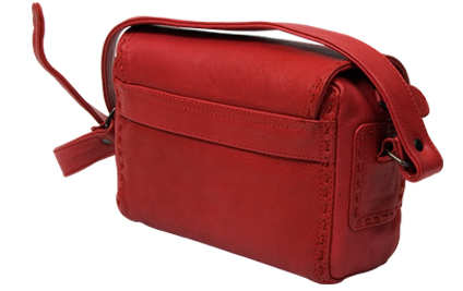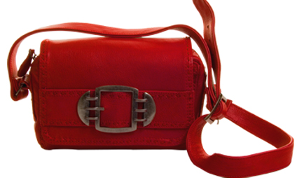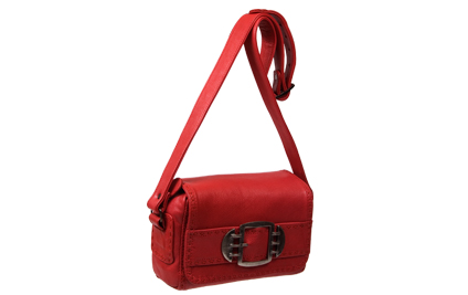 Red leather bag with ornate threading, bag flap with a ornamental buckle. Adjustable strap.