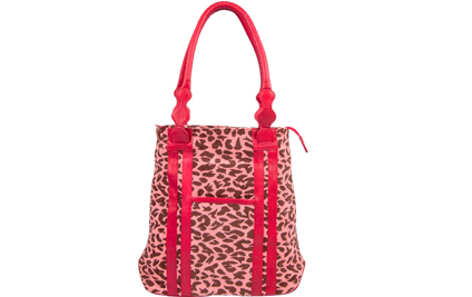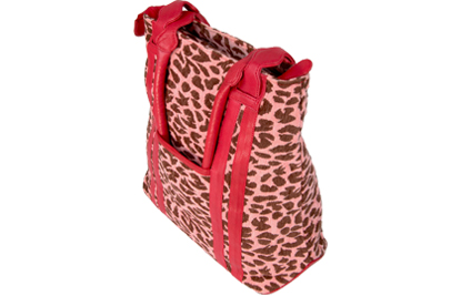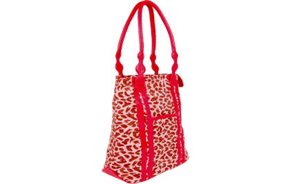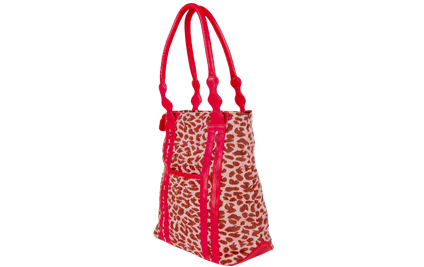 Strawberry / brown fabric exterior with red leather trims. Red leather base with nickel feet. Red felt inner lining. Exterior pockets in the both sides, multiple interior pockets and zip closure.