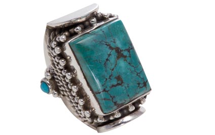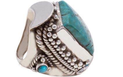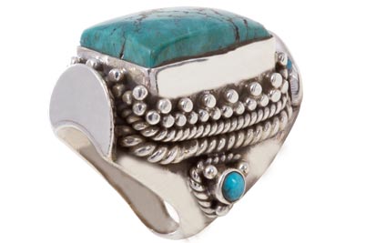 Sterling silver ring with a centerpiece turquoise stone surrounded by handcrafted ornate design.