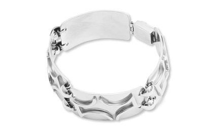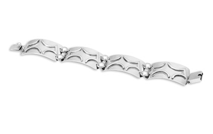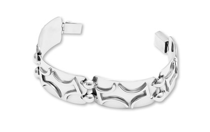 Four rectangular shaped segments joined by round nail head links. Secure slide-locking closure.