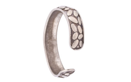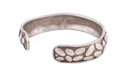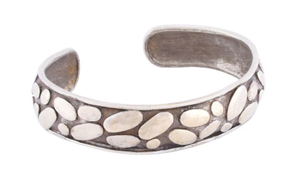 Random pebble-shaped pieces embedded on dark finished surface. Bracelet has some flexibility to allow for size adjustment.