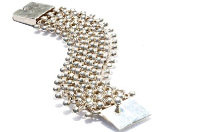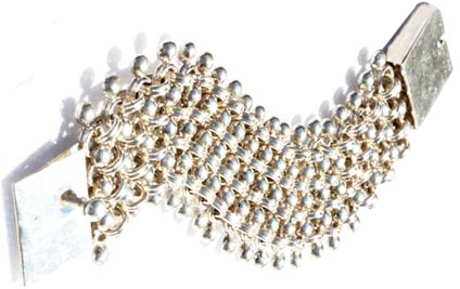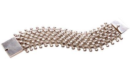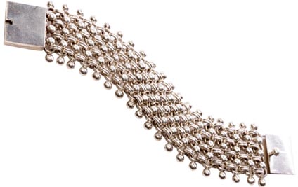 Rows of sliver nail heads tightly interlaced among the linked silver strands. Secure slide-locking clasp.