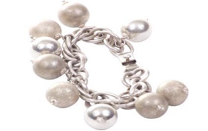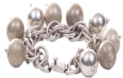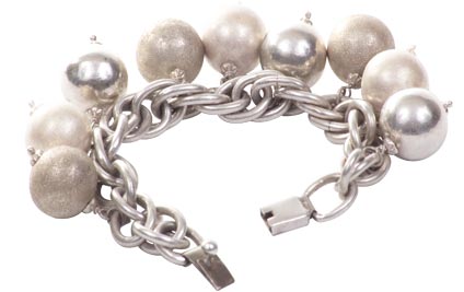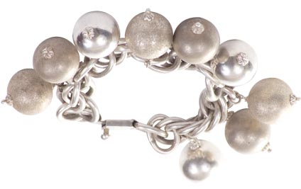 This bauble charm bracelet has nine silver orbs that are suspended in metallic, matte and glossy finish from interwoven sterling silver link bracelet. Secure slide locking clasp.