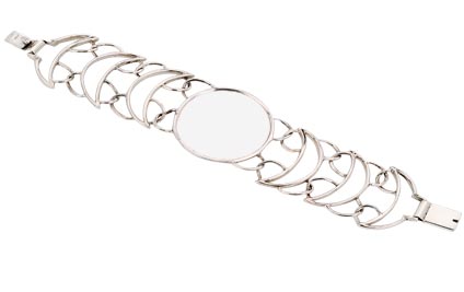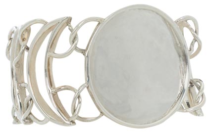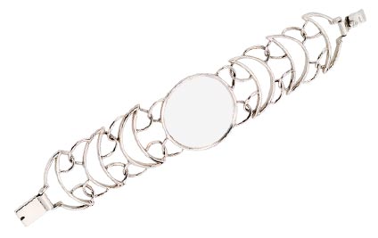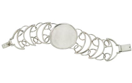 Sterling silver center flat medallion with raised rim sides, flanked by sterling moon-shaped links. Suitable for monogramming. Slide bar closure.