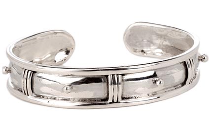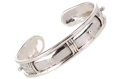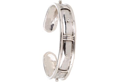 Bamboo-inspired cuff bracelet with raised edges. Flexible to allow for size adjustment.