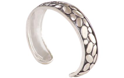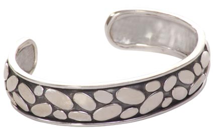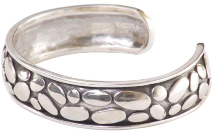 Random pebble-shaped pieces embedded on dark finished surface. Bracelet has some flexibility to allow for size adjustment.