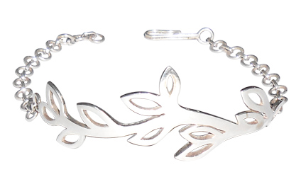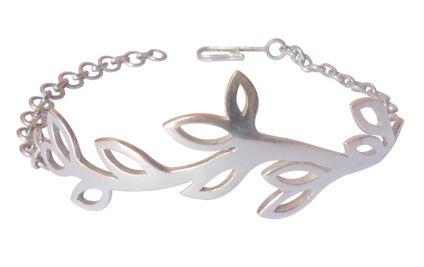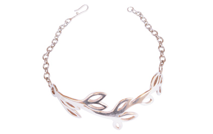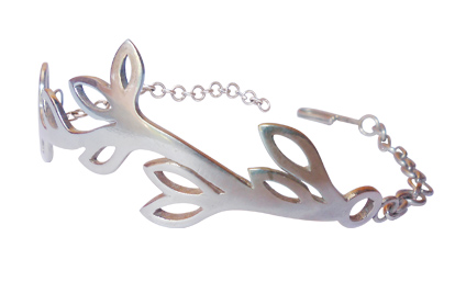 Leaf design motif with smooth finish connected to silver chain at both ends. Hook closure.