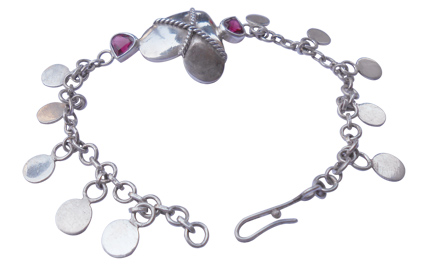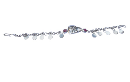 Heart shaped pendant connected to ornate chain with silver circles hanging from the chain. Hook closure.