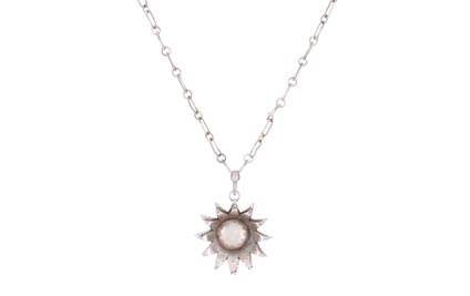 Ornate pendant in the shape of Lotus flower designed in a circle. Perfect for any nature lover. German Silver chain included. Hook closure.