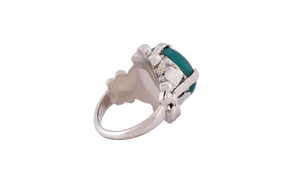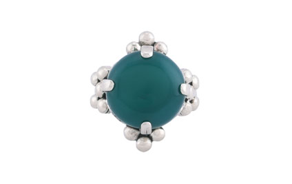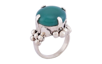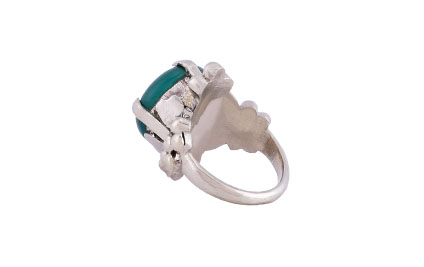 German Silver ring with a rounded green onyx stone anchored by four ornate posts.