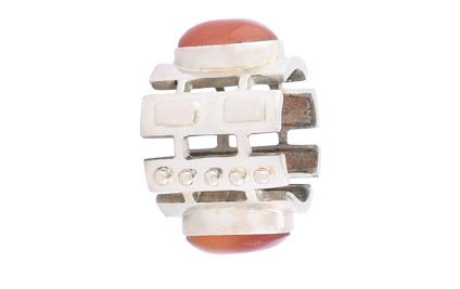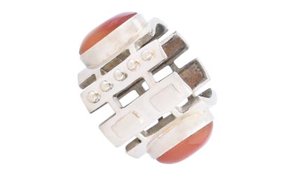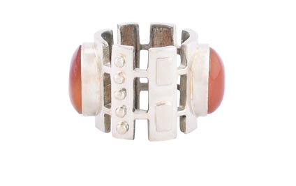 German silver band with dramatic motif around two carnelian stones. Available in size 8.