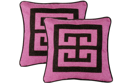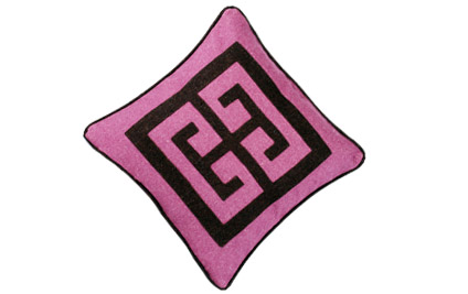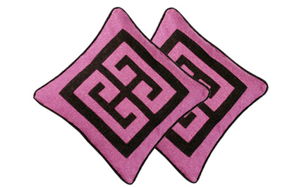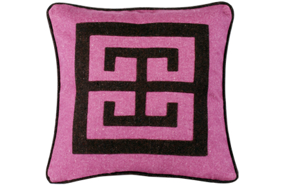 Heathered raspberry field with brown heathered applique in Wool. 22" x 22" (poly foam pillow included). Side zip permits easy access for removal and cleaning.