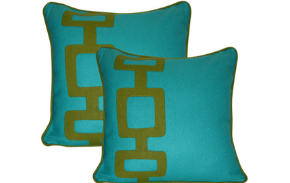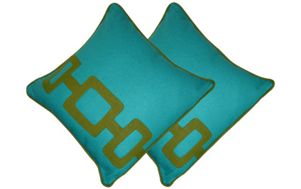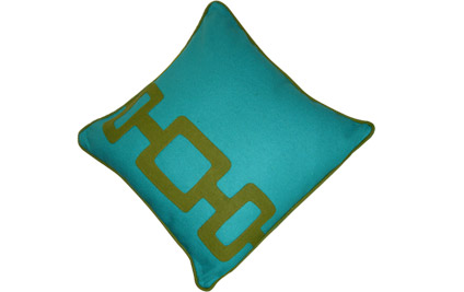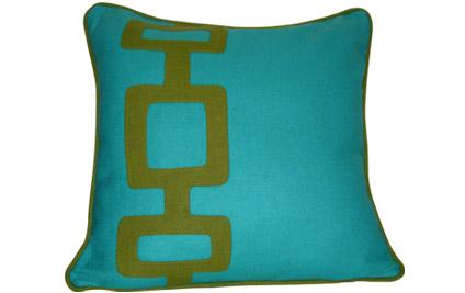 Light Aqua field with Green applique in Wool. 22" x 22" (poly foam pillow included). Side zip permits easy access for removal and cleaning.