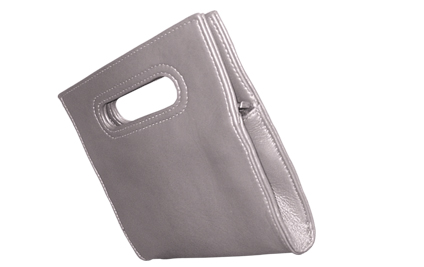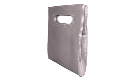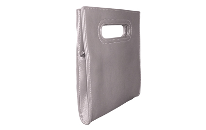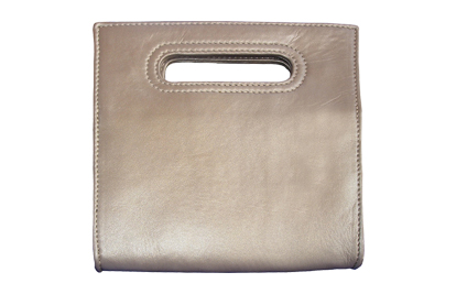 Titon (Golden-Brown) leather clutch with purple suede lining. Magnetic snap closure.