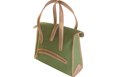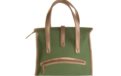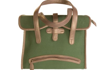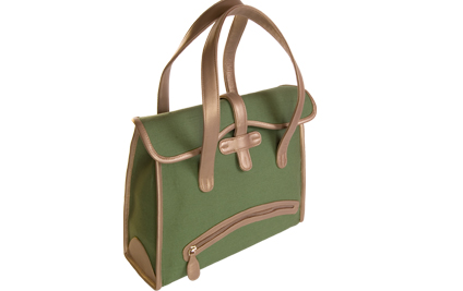 Green canvas bag with titon leather trims and pockets. Golden-brown fabric inner lining, multiple interior and exterior pockets, zip closure.