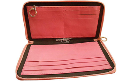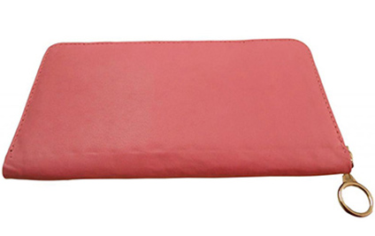 A great companion wallet crafted from pink leather with black polyester inner lining. Design includes multiple slots to carry everyday essentials. Zipper closure.