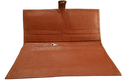 A great companion wallet crafted from brown leather with black polyester inner lining. Design includes multiple slots to carry everyday essentials. Button closure.